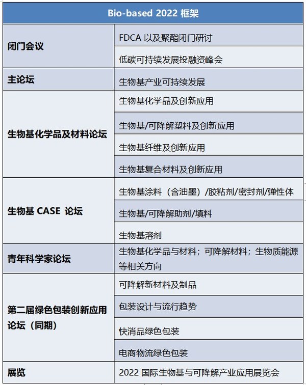 生物基化学品与材料论坛聚焦生物质能源、生物基平台化合物、生物基塑料、生物基纤维、生物基复合材料的新来源、新技术、新工艺、新产品以及创新应用;生物基CASE论坛聚焦生物基涂料(含油墨)、胶粘剂、密封剂、弹性体、助剂、溶剂等产品往低碳、无醛、无毒、可持续发展方向的产业化应用进展;青年科学家论坛展示高校与研究所青年才俊在合成生物学、生物基化学品与材料、生物质能源、生物基CASE、生物可降解材料领域的最新研究成果;绿色包装创新应用论坛聚焦绿色包装制品、环保材料、低碳工艺、创新设计、循环利用等发展热点进行探讨,提出解决方案,实现包装全产业链可持续发展和共同繁荣。
