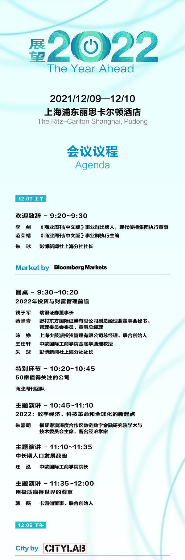 由《商业周刊/中文版》主办的“The Year Ahead展望2022峰会”,将于2021年12月9-10日在上海浦东陆家嘴国际金融中心丽思卡尔顿酒店盛大举办,来自金融、消费、零售、创投、科技、文创等多个领域的50余位嘉宾将亲临现场,共同展望2022年商业世界的变革及规律,谱写统观天下的恢弘篇章。