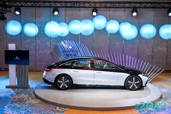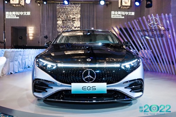 活动现场观众坐席后方,还有一处别具匠心的布置,奔驰电动旗舰全新EQS与到场的来宾一同展望2022。