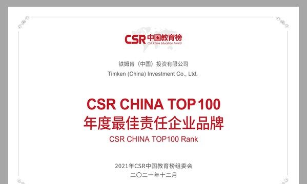 中国上海2021年12月16日 /新闻稿网 - Xinwengao.com/ — 全球工程轴承和动力传动产品领导者铁姆肯公司(纽约证交所股票代码:TKR)凭借“TIMKEN益践未来 · STEM教育公益项目”荣获“CSR CHINA TOP100年度最佳责任企业品牌”奖。该奖项由CSR中国教育榜评选,旨在鼓励和表彰支持中国教育发展的优秀企业社会责任(CSR) 项目,以及在CSR教育领域做出突出贡献的企业和组织。