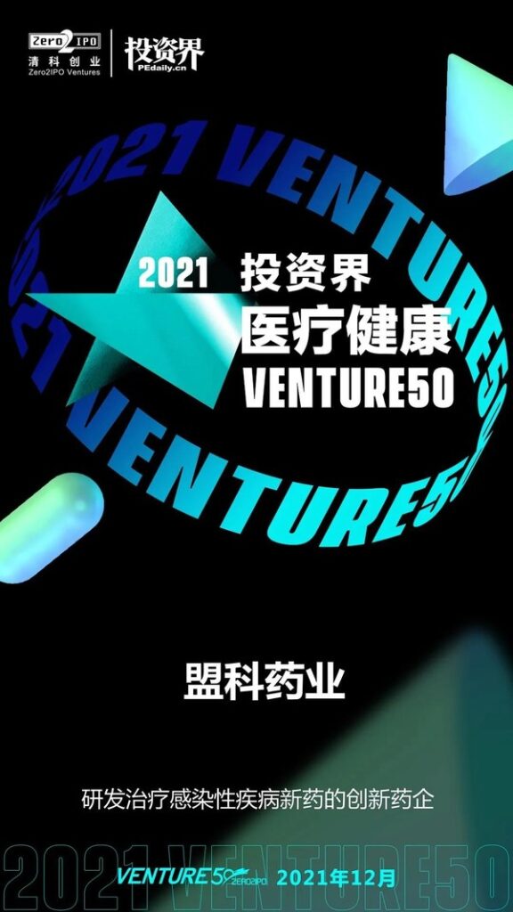 上海2021年12月17日 /新闻稿网 - Xinwengao.com/ — 12月15日,由清科创业、投资界发起的2021 Venture50终评榜单正式出炉。盟科药业凭借在抗感染领域的亮眼表现和高速成长,获得众多评委专家的投票认可,荣登“2021投资界医疗健康VENTURE50”榜单!