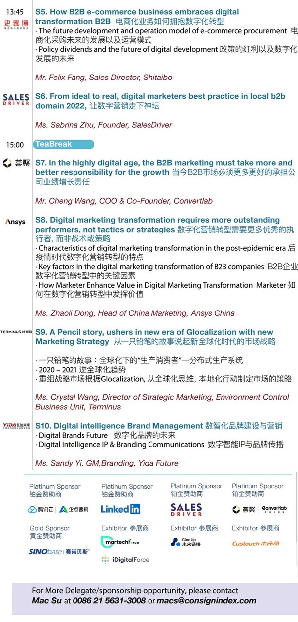 本次活动,我们将探讨新的营销场景和基础,随着营销创新的不断深入,B2B营销趋势朝着标准化、分散化、现代化的方向发展。我们希望能对在过去一年因经济变化、新冠疫情、地方法规、技术创新发展对B2B影响产生的重要影响取得认知。全球本土化(本土化的全球化效应)被定义为驱动本土化离散化创新的营销聚合。但更重要的是我们如何将这些营销“混乱”纳入标准化的营销流程,这就是本次大会的主题“全球本土化”。