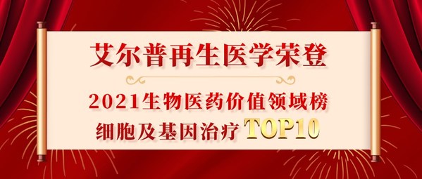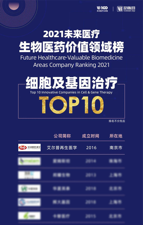 2021年12月13日,VB100-2021(未来医疗100强)联合动脉网发布了“2021生物医药价值领域榜”榜单,在一批具有高成长性的企业中,艾尔普再生医学荣登2021生物医药价值领域榜 — 细胞及基因治疗TOP10。