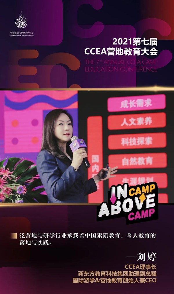 CCEA中营联理事长、新东方国际游学&营地教育CEO刘婷老师发表了本届大会的开幕演讲。刘婷老师在演讲中提到,从今年的“双减”政策背后,我们看到中国政府不鼓励仅仅注重提升学生分数和应试的教育,而更应该注重培养孩子综合能力的素质教育和全人教育,帮助孩子塑造品格、磨练意志、振奋精神、强化能力。