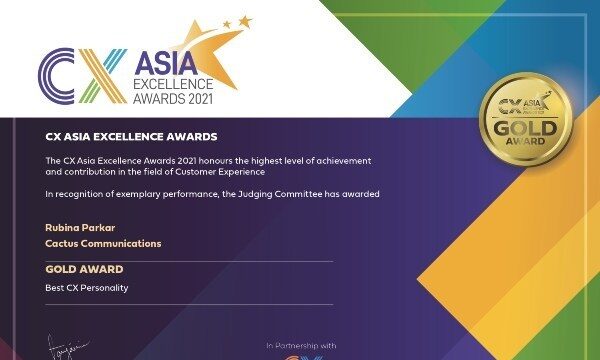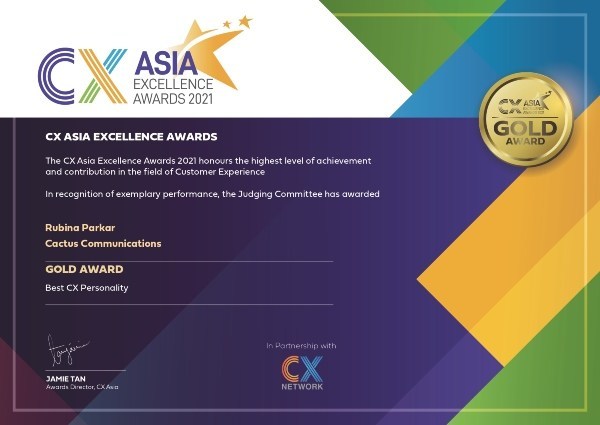 Cactus Communications凭借在新冠期间为客户提供的免费服务获得“最佳品牌体验”铜奖;并因Infiniti(开科思“雇员及客户创新计划”)和“终生客户计划”(一项推崇以客户为中心的创新举措)荣获“最佳客户至上文化”银奖。此外,Cactus Communications 的客户体验及质量部副总裁 Rubina Parkar 赢得“最佳客户体验杰出个人”金奖。2019至2021财年期间,Rubina 副总裁领导和实施了多项客户体验计划,大幅改善了客户服务质量。