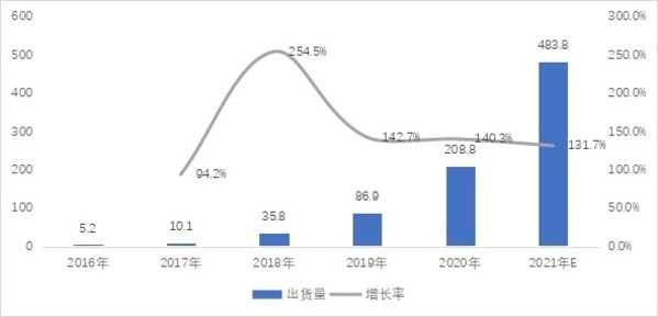 我国便携式储能行业是外向型特征十分明显的行业,全行业超过90%的产量出口,是世界便携式储能的制造大国和外贸出口大国。得益于我国新能源汽车、储能和上游锂电池行业的快速发展,便携式储能领域迅速发展壮大。2016年,中国便携式储能总出货量4.8万台,预计2021年总出货量将达到438.8万台,复合增长率达到146%。随着经济的进一步发展以及产品成本的进一步下降,便携式储能产品的市场渗透率将持续提高,市场空间广阔。