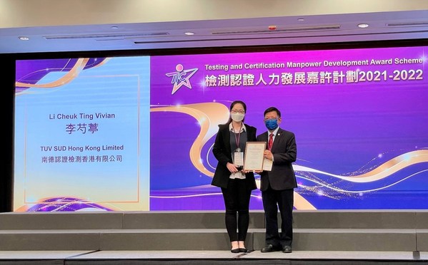香港2021年12月23日 /新闻稿网 - Xinwengao.com/ — 近日,南德认证检测香港有限公司(以下简称“TUV南德”)荣获由香港检测和认证局颁发的“2021-2022检测认证人力发展机构”奖,以表彰其在推动检测认证从业者的人力和专业发展方面的出色表现。此外,来自TUV南德化学实验室的Vivian Li女士荣获“卓越检测认证专业人员”奖,以表彰其在提升服务质素及生产力方面的卓越贡献。