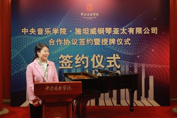 上海2022年1月4日 /新闻稿网 - Xinwengao.com/ — 2021年12月28日,“中央音乐学院钢琴系施坦威艺术实践基地”签约授牌仪式及“中央音乐学院钢琴系钢琴调律与修复专业合作教学”签约仪式在中央音乐学院南大殿成功举行。中央音乐学院是中国乃至全世界最著名的高等音乐学府之一,施坦威与中央院有着数十年的良好合作关系,此次仪式的成功举行标志着双方的合作取得了最新的成果。 中央音乐学院校长俞峰,中央音乐学院副校长于红梅,中央音乐学院院长办公室主任、党委宣传部副部长王歆,中央音乐学院钢琴系副主任韦丹文,中央音乐学院乐器管理中心主任赵东升和施坦威亚太区总裁位炜,施坦威亚太区销售总监吴坚出席了仪式。 “中央音乐学院钢琴系施坦威艺术实践基地”授牌仪式;吴坚、位炜、俞峰、于红梅、韦丹文、赵东升、王歆(从左至右) 2010年,中央音乐学院钢琴系正式成为“全施坦威学校”,施坦威艺术家郎朗和王羽佳都是该校的杰出校友;2015年,中央音乐学院与施坦威公司共同开设“中央音乐学院 – 施坦威钢琴技师教学中心”,共同促进国内钢琴技术服务的进步,支持音乐文化和音乐教育的发展。2017年,在施坦威之家纽约建立“中央音乐学院民族音乐美国教学点”,致力于推动中国民族音乐走向世界。 “中央音乐学院钢琴系钢琴调律与修复专业合作教学”签约仪式;吴坚、位炜、韦丹文、俞峰、于红梅、赵东升、王歆(从左至右) 施坦威亚太区总裁位炜女士发表致辞,“在168年的时间里,施坦威一直致力于‘制造世界上最好的钢琴’,同时,也一直为钢琴演奏家、钢琴教师、钢琴学习者、钢琴音乐爱好者们提供资源支持。今天,我们在这里又将与中央音乐学院钢琴系开展全新的合作, 以‘中央音乐学院钢琴系施坦威艺术实践基地’为基础,为钢琴系的学生们,也是未来的钢琴演奏家们,提供更多的演出实践机会;也通过这一机会,能将中央音乐学院钢琴系学生们优秀的演奏带到更多城市,以促进音乐艺术的全民普及。同时,我们也将通过‘中央音乐学院钢琴系钢琴调律与修复专业合作教学’的项目,切实培养钢琴调律高实践性专业人才。” 施坦威亚太区总裁位炜女士发表致辞 中央音乐学院校长俞峰先生发表致辞,“此次合作的达成,实现了优质人才、优质课程与优质平台的强强联合,为中国专业艺术人才培养、国际交流、学术实践等方面走出了重要的一步。能够为培养和造就德才兼备的高素质人才搭建平台与纽带,为激发广大师生凝心聚力共筑中国梦树立决心与信心。表明了中央音乐学院将美育教育深扎落实,坚守为党育人、为国育才的使命和担当。中央音乐学院非常期待与施坦威继续携手,积极响应国家文化强国战略,为促进音乐艺术长远发展贡献自己的力量!” 中央音乐学院钢琴系副主任韦丹文主持了签约仪式并发表感言,“为促进音乐艺术长远发展,践行音乐艺术教学与实践的互动发展理念,中央音乐学院钢琴系与施坦威在多年的良好合作基础上,通过此次合作,进一步加强学生的专业性,也让学生们在校内学习以外获得更多必要的演奏实践经验。” 活动最后,中央音乐学院钢琴系研究生二年级学生、2021年中国音乐金钟奖获得者沈天琳为在场嘉宾带来了精彩的演奏,展现了央音学生高水准的演奏技艺。