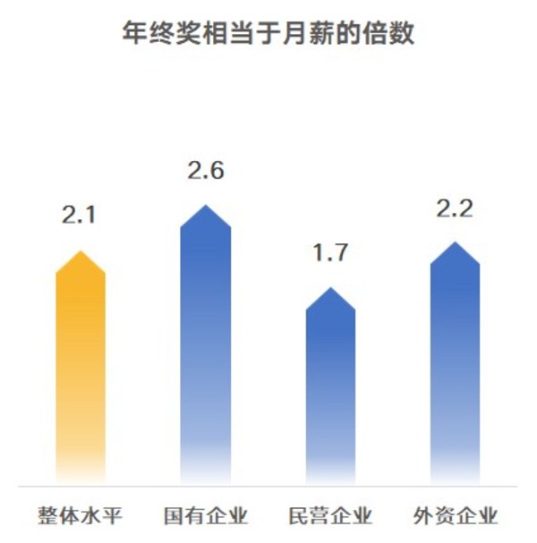 从年终奖相当于月薪的倍数来看,整体水平为2.1倍,相比2020年的1.8倍有提升;其中国有企业最高(2.6倍),民营企业最低(1.7倍),外资企业平均为2.2倍。