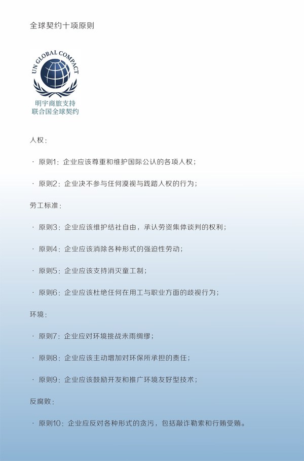 联合国全球契约组织是世界上最大的推进企业可持续发展的国际组织,拥有来自160多个国家的一万多家企业和其他利益相关方会员。这些会员承诺履行以联合国公约为基础,涵盖人权、劳工标准、环境和反腐败领域的全球契约十项原则并每年报告进展。联合国全球契约组织持续帮助企业将全球契约十项原则整合到其战略和运营中去,通过合作与伙伴关系共同推进更广泛的联合国目标的实现,例如:联合国可持续发展目标(SDGs)。中国政府作为联合国全球契约组织的捐款国政府,长期支持联合国以及联合国全球契约组织在全球与中国的可持续发展工作的进展推动。联合国全球契约组织的中国主要参与者有国家电网、国家开发银行、华为、中国工商银行、茅台、伊利、中国联通、中石化、中石油、中国移动、通威集团等。