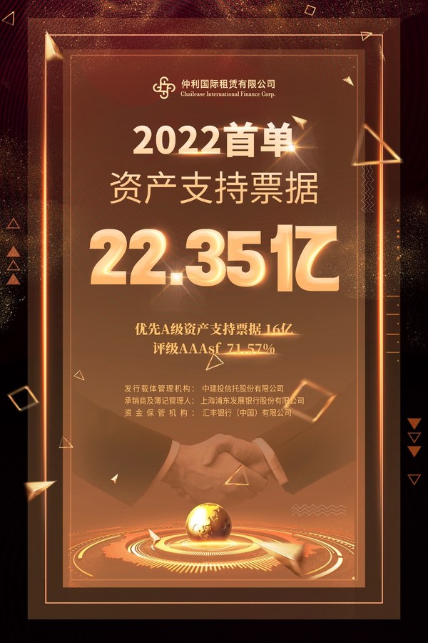 上海2022年1月17日 /新闻稿网 - Xinwengao.com/ — 2022年1月13日,仲利国际租赁有限公司成功发行2022年度第一单定向资产支持票据,发行总规模为人民币22.35亿。其中,优先A级资产支持票据发行额为人民币16亿,评级为AAAsf,占比71.57%;次级资产支持票据发行额为人民币6.35亿,占比28.43%。