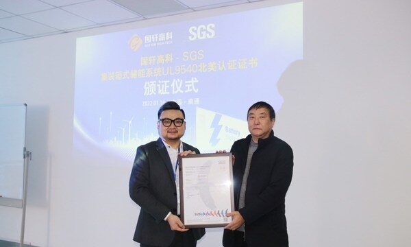 上海2022年1月18日 /新闻稿网 - Xinwengao.com/ — 2022年1月14日,国际公认的测试、检验和认证机构SGS在南通国轩高科新能源产业基地为国轩高科股份有限公司(以下简称:国轩高科)颁发UL 9540认证证书。该证书的获得不仅彰显其系统在安全和质量方面均达到全球最高标准的要求,更为其在北美市场的安全和可靠运行提供了非常有力的技术保障。