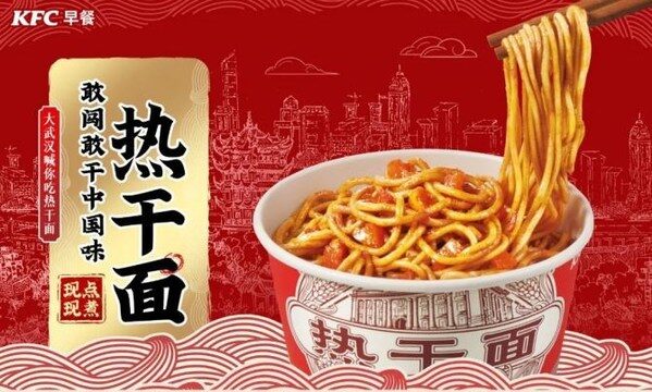 2021年1月,肯德基在武汉超过100家门店开卖热干面。这是肯德基进入中国市场以来,第一次卖面条。在不同城市推出了一系列当地小吃后,热干面是第一个走向肯德基全国餐厅的地域美食。2021年9月,热干面作为限期供应产品在全国上市,取得了不俗的销售表现。上市当周即售出超出100万碗,成为过去三年最热销的限时供应早餐产品。
