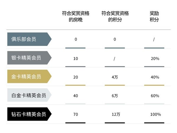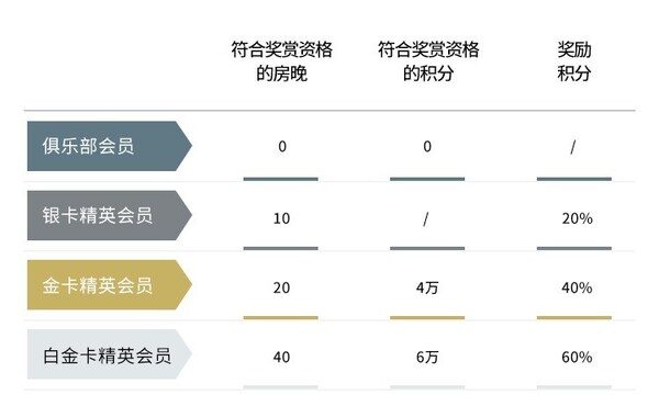 - 累积20晚符合奖赏标准住宿,可升级至“金卡精英会员”(Gold Elite),额外奖励积分为行业领先的40%