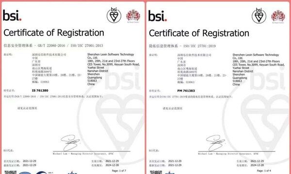 北京2022年1月21日 /新闻稿网 - Xinwengao.com/ — 近日,国际权威认证机构BSI正式授予乐信ISO/IEC 27001:2013及ISO/IEC 27701:2019两项认证证书。作为国内领先的新消费数字科技服务商,乐信长期对标国际领先标准践行信息安全管理责任,此次通过两项国际权威认证,意味着乐信信息安全管理体系和隐私信息管理体系已达到国际标准水平,以满足广大合作伙伴、近1.6亿消费者及各相关方对乐信信息安全管理能力的期望。