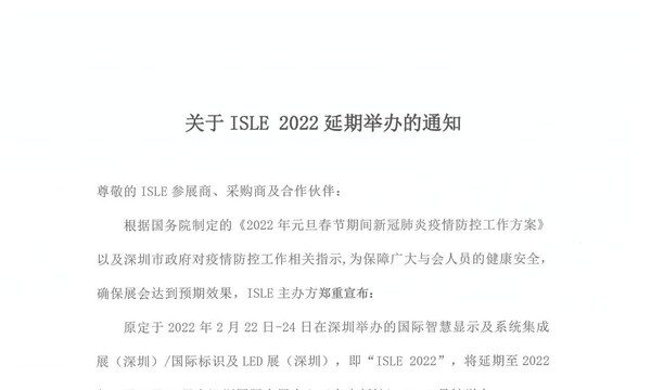 广州2022年1月24日 /新闻稿网 - Xinwengao.com/ — 近日,国际智慧显示及系统集成展(深圳)/国际标识及LED展(深圳),即“ISLE 2022”,组委会发布了关于“ISLE 2022延期举办的通知”公告,全文如下: