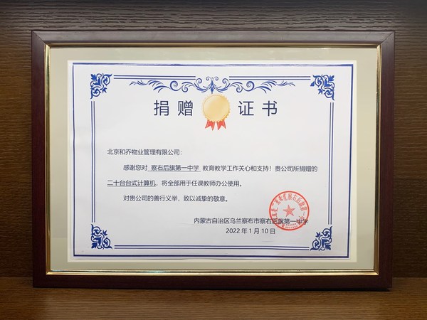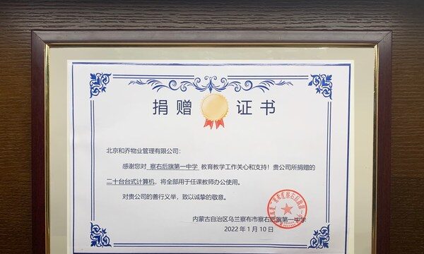 北京2022年1月24日 /新闻稿网 - Xinwengao.com/ — 为帮助学校改善教学条件,优化教学设备,成旅集团旗下的北京和乔物业管理有限公司积极响应北京市朝阳区建外街道对口扶贫捐赠计划,向内蒙古自治区察右后旗第一中学捐赠电脑20台。原计划现场捐赠,受疫情影响,严格遵守防疫要求,改为邮寄捐赠。