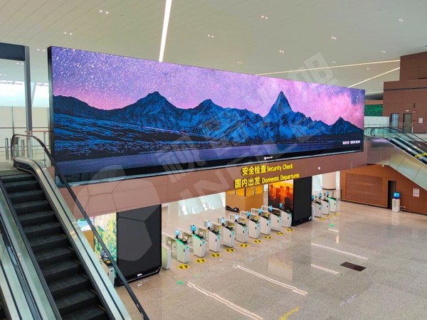 天府国际机场位于成都东部新区,定位为国家级航空枢纽、丝绸之路经济带中等级最高的航空港,负责成都出港的所有国际航线,已于2021年6月正式投入使用。视爵光旭以天府机场切实需求为出发点,选用旗下领秀系列搭建T2航站楼出发大厅的尺寸为20×3.75m的超高清LED显示大屏及机场安检处共4块吊装显示屏,为天府国际机场提供高品质的可视化平台,助力打造智慧交通枢纽。