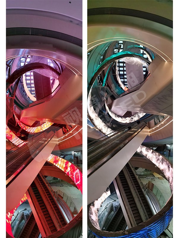 广州星寰国际商业中心位于广州历史中轴线和珠江交汇点,属于广州打造“一江两岸三带”规划的重要位置。视爵光旭为星寰国际商业中心打造的是长为133米,宽为1.6米的双面丝带屏,屏组高度高达50米,蜿蜒曲折的双面显示屏犹如丝带一般环绕着扶梯,在商场的中空地带盘旋而上,美不胜收!