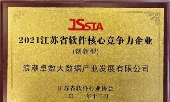 济南2022年1月25日 /新闻稿网 - Xinwengao.com/ — 12月27日,由江苏省工信厅、科技厅、民政厅指导,省软协主办的第三届江苏软件产业发展大会在南京顺利举行,本次会议邀请省工信厅、省民政厅、省科技厅相关领导和负责人及省内软件企业代表共百余人参会。会上,浪潮卓数大数据产业发展有限公司入选“2021江苏省软件核心竞争力企业”。