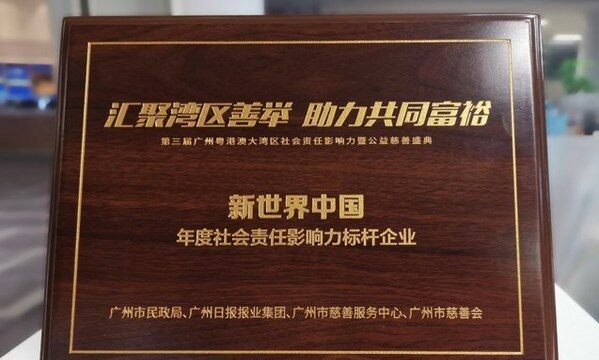 广州2022年1月26日 /新闻稿网 - Xinwengao.com/ — 1月19日,由广州市民政局、广州日报报业集团、广州市慈善会联合主办的第三届粤港澳大湾区社会影响力暨公益慈善盛典隆重举行,广州市政府相关单位领导、企业代表、专家学者及慈善家出席并共同见证2021年度广州慈善榜的发布。新世界中国2021年向社会各界捐赠超过3600万元人民币,并凭借在脱贫攻坚、医疗健康、抗疫救灾、公共事业等领域的卓越公益慈善贡献,荣获“年度社会责任影响力标杆企业”,并荣登“2021年度五星慈善单位榜”前十名,成为助力共同富裕的港企先锋。