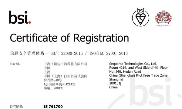 序祯达是国内基因技术领域和多组学研究服务行业中少数通过了严格的第三方审计,获得ISO27001认证的企业。这标志着公司信息安全体系建设、隐私保护方面的努力获得了国际组织的认可。在企业信息安全领域拥有绝对可靠性,降低数据泄密风险,更好的保存核心数据,这些数据和分析将用于新型精准药物的发现、临床试验和为商业化提供重要参考依据。