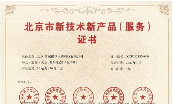 北京2022年2月7日 /新闻稿网 - Xinwengao.com/ — 生物医药高科技公司诺诚健华(香港联交所代码:09969)今天宣布,凭借在技术先进性、创新性、潜在经济效益和较大市场前景等方面的核心优势,国家“重大新药创制”专项成果奥布替尼片(宜诺凯)通过北京市五大政府部门权威认定,荣获“北京市新技术新产品(服务)证书”。
