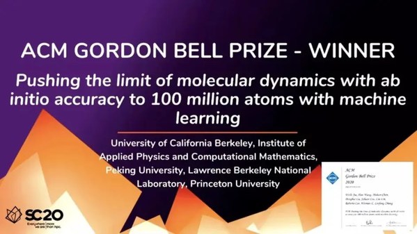 以机器学习、深度学习为代表的人工智能成为分子动力学研究的突破口。而人工智能+科学研究+高性能计算(AI+Science+HPC)则意味着AI的复杂数据处理能力和Science的第一性原理与HPC的超强算力的结合。其代表性成果就是荣获2020年戈登·贝尔奖的机器学习分子动力学应用DeePMD-kit。