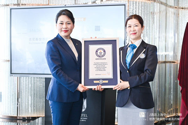 上海2022年2月22日 /新闻稿网 - Xinwengao.com/ — 今天J酒店上海中心天之锦餐厅打破吉尼斯世界纪录™,成为“建筑物中最高的餐厅”最新纪录保持者。天之锦餐厅以距离地面556.36米的高度打破了原纪录保持者在2011年创造的441.3米的纪录,以绝对的优势刷新了这一项保持了十年之久的世界纪录。天之锦餐厅是J酒店上海中心七家餐厅和酒廊之一,于2021年6月开业,位于上海中心大厦120层,以目前全球建筑物中最高的景观餐厅为宾客提供丰盛美食和专业服务。餐厅共有256个餐位,包含5个私人包间和中心吧台,提供午餐、下午茶和晚餐。天之锦餐厅吸收欧洲、日本与中国餐饮精髓,创造融合菜品,让传统美食焕发新的活力。