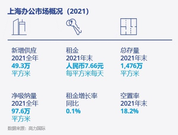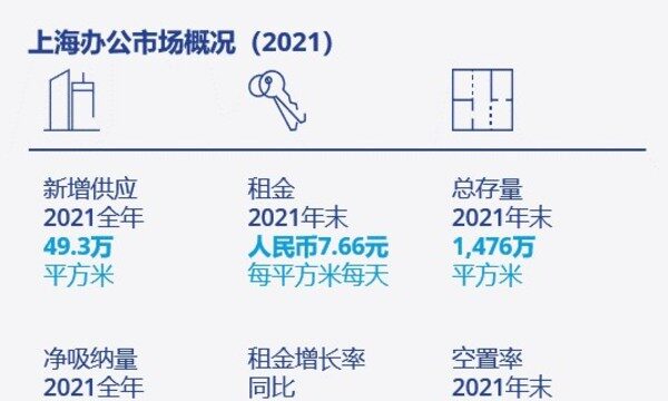 2021年,上海市甲级写字楼租赁需求强劲,全年净吸纳量是2020年的近3倍,助推租金在年内触底反弹。