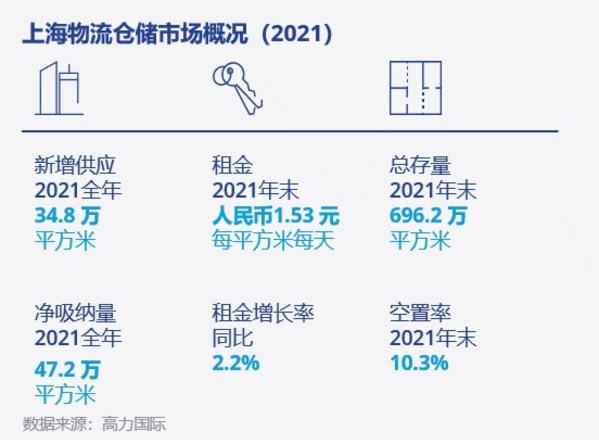 2021年上海全市高标仓平均租金为人民币1.53元/平方米/天,较2020年上涨了2.2%。