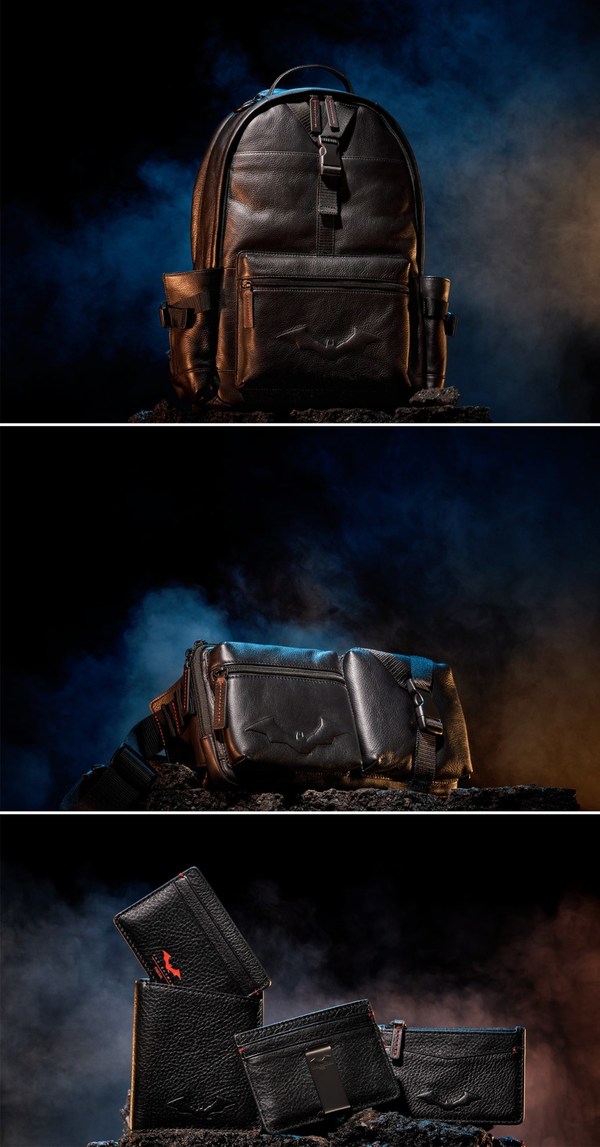 Batman Backpack 蝙蝠侠背包设计大胆且兼顾实用性,灵感源自《新蝙蝠侠》中的蝙蝠装甲独特鲜明的造型。这款背包采用纯黑色皮革,配有四个外袋,肩带上装有MOLLE条和快扣,确保使用时的安全性和功能性。其以硅胶注塑蝙蝠侠徽标及醒目的红色装饰为设计特色。与该背包一起推出的还有收藏版皮革配饰,以蝙蝠侠的标志性套装和盔甲为蓝本打造,用黑色皮革和醒目的红色铆钉制作而成,售价为人民币3,190元。Batman Waistpack 蝙蝠侠腰包配有四个外袋、MOLLE条,还能摇身一变成为一个斜挎包,售价为人民币1,590元。Batman Zipper Card Case 蝙蝠侠拉链式卡包配有三个卡槽,包括一个放证件的卡槽、一个安全可靠的拉链式隔层和一个硅胶注塑蝙蝠徽章;Batman 2-In-1 Bifold Wallet 蝙蝠侠钱包则有一个可从前袋取出的卡包和一个硅胶注塑蝙蝠徽章。此外,还推出一款独立卡包,有六个卡槽、一个可拆卸的钱夹和一个内嵌式金属蝙蝠徽章。3款皮具售价分别为人民币490元(蝙蝠侠拉链式卡包)、人民币590元(蝙蝠侠钱包)和人民币490元(蝙蝠侠卡包)。