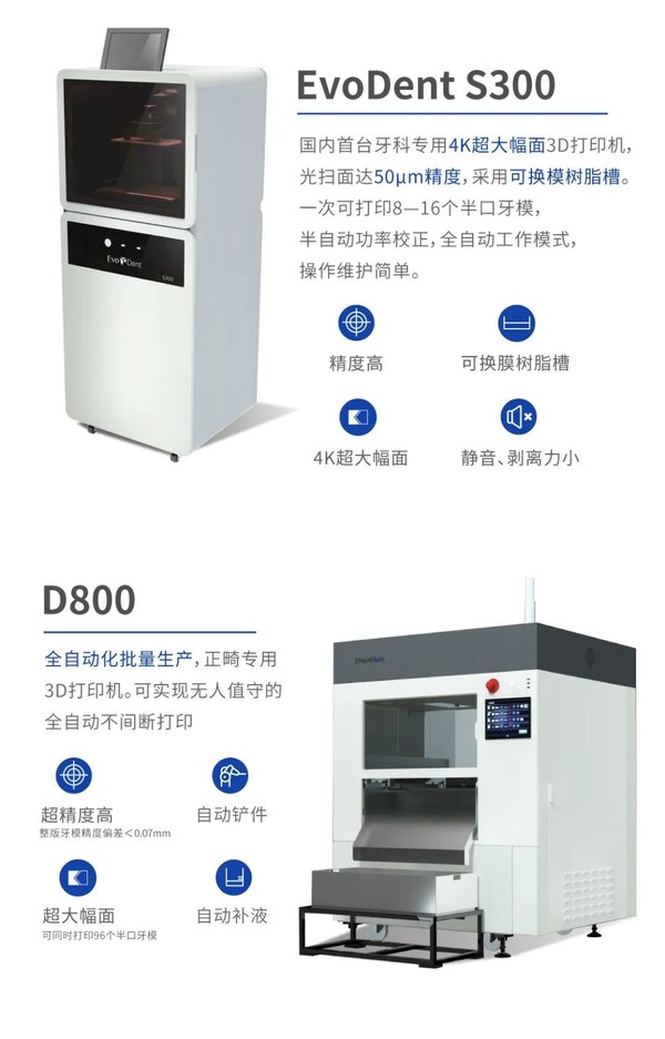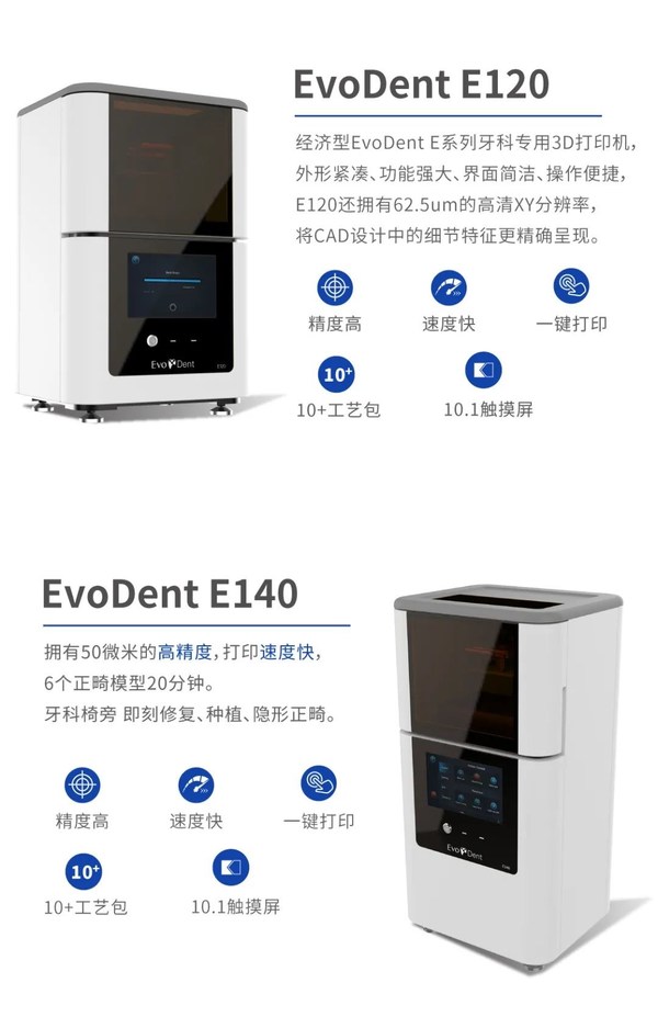 近几年来联泰科技深入布局齿科行业,在齿科领域迅速发展。艾沃德EvoDent是上海联泰科技股份有限公司于2017年7月推出的牙科专用3D打印机品牌,通过与世界各地牙科专家的深度合作,将光固化技术应用于牙科,并由此研发出EvoDent E系列、D系列以及S系列等产品,旨在以专业的3D打印技术,改变牙科加工方式,从传统制造向数字化转型,定义牙科不同应用的3D打印标准。