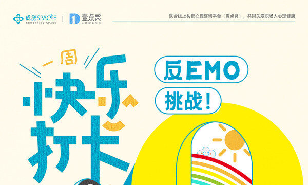 北京2022年3月14日 /新闻稿网 - Xinwengao.com/ — 由成旅SPACiE联合办公携手国内知名线上心理咨询平台壹点灵开展的关爱职场人心理健康活动 — 《反emo挑战,一周快乐打卡》今天正式开幕。当前,高压社会加之新冠疫情的影响下,职场人遭遇的心理健康问题越发普遍。《反emo挑战,一周快乐打卡》旨在邀请职场人通过拍摄与分享,记录下生活中美好的小事件。借此累积积极能量,避免负面情绪,提升心理健康指数。本次活动将一直持续到3月23日。