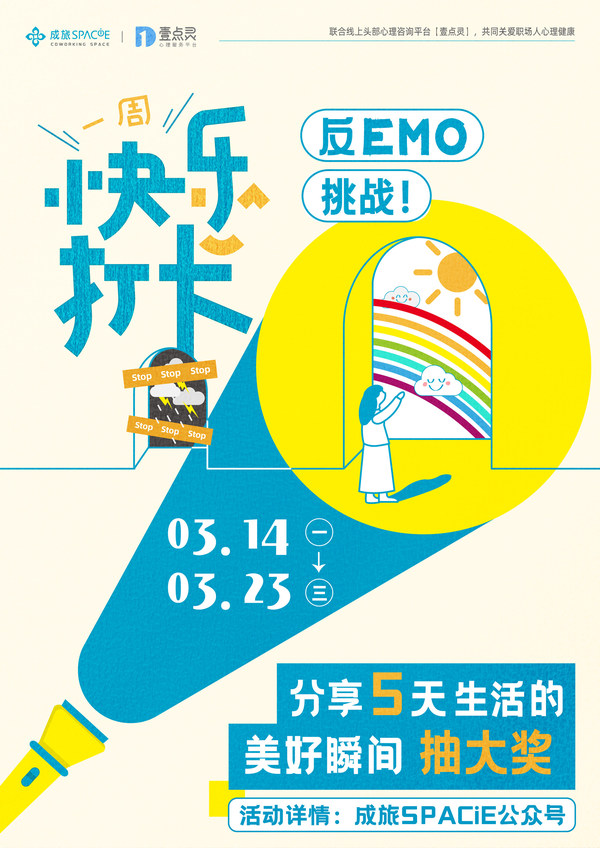 成旅SPACiE联合办公为鼓励职场人一同挖掘快乐,此次《反emo挑战,一周快乐打卡》活动,特别邀请了心理健康领域的头部平台壹点灵合作,凡报名参加即可获得壹点灵提供的免费专业心理健康测评与倾诉服务。此外,连续5日参与成旅SPACiE于抖音平台创建的话题挑战 #成旅一周快乐打卡,即可抽大奖(手机与拍立得)。