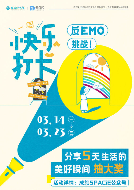 北京2022年3月14日 /新闻稿网 - Xinwengao.com/ — 由成旅SPACiE联合办公携手国内知名线上心理咨询平台壹点灵开展的关爱职场人心理健康活动 — 《反emo挑战,一周快乐打卡》今天正式开幕。当前,高压社会加之新冠疫情的影响下,职场人遭遇的心理健康问题越发普遍。《反emo挑战,一周快乐打卡》旨在邀请职场人通过拍摄与分享,记录下生活中美好的小事件。借此累积积极能量,避免负面情绪,提升心理健康指数。本次活动将一直持续到3月23日。