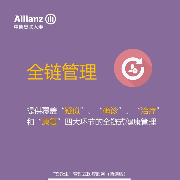 中德安联人寿依托数字化技术革新,在“安联在线”平台上全新推出“有人管”的健康管理服务——“安逸生”管理式医疗服务(智选版)。一旦客户疑似罹患或确诊指定疾病,由专业医生和健康管家组成的专属团队会第一时间介入,为客户提供覆盖“疑似”、“确诊”、“治疗”和“康复”四大环节的全链式健康管理,丰富优质客户增值服务内涵,拓展保险服务的广度和深度。
