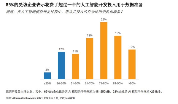 在这样的背景下,企业Al研发越来越注重将资源投入到获取高质量训练数据的工作,而不只是模型训练。IDC 调研发现,全球85%的受访企业表示花费了超过一半的人工智能开发投入用于数据准备。
