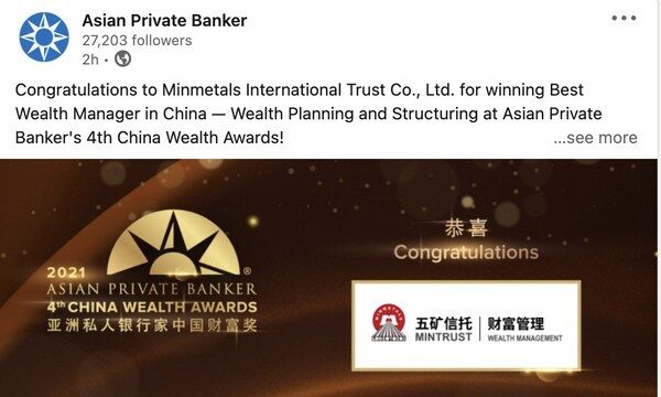 北京2022年3月17日 /新闻稿网 - Xinwengao.com/ — 3月16日,享誉亚太私人银行与财富管理市场的《亚洲私人银行家》(Asian Private Banker)授予五矿信托财富管理“中国最佳财富管理机构—财富规划和安排”独家大奖。