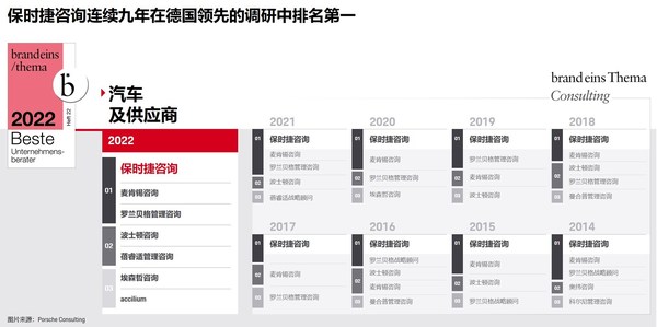 上海2022年3月18日 /新闻稿网 - Xinwengao.com/ — 近日,德国著名商业周刊《brand eins》发布了“2022年最佳管理咨询”排行榜。保时捷管理咨询连续9年斩获“最佳管理咨询公司”殊荣,在“汽车及供应商”和“运营管理”领域再次夺魁,同时也在许多其他领域得到高分。