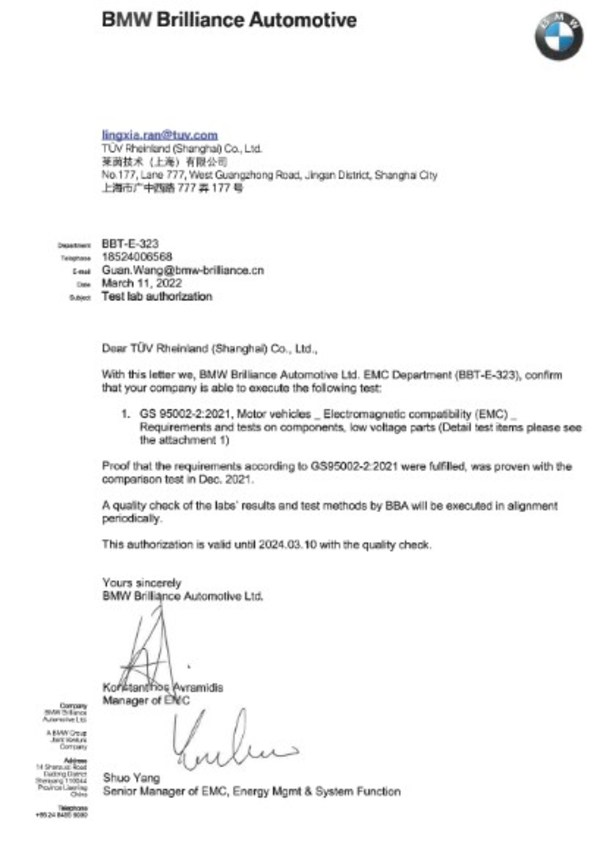 上海2022年3月18日 /新闻稿网 - Xinwengao.com/ — 近日,国际独立第三方检测、检验和认证机构德国莱茵TUV大中华区(以下简称“TUV莱茵”)位于上海的汽车电子电磁兼容(EMC)实验室获华晨宝马汽车有限公司(简称“华晨宝马”)授权,可承接其基于GS 95002-2:2021的低压零部件EMC测试。这意味着TUV莱茵在技术专业性、人员配备、实验室技术资质、附加服务等方面再次得到国际主流车企的肯定。