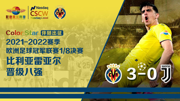 纽约2022年3月19日 /新闻稿网 - Xinwengao.com/ — 美东时间3月16日,彩色星球科技【纳斯达克代码:cscw,以下简称:彩星科技】深度合作的国际西甲球队-比利亚雷亚尔队在意大利都灵举行的2021-2022赛季欧洲足球冠军联赛八分之一决赛次回合比赛中,客场以3比0战胜意甲尤文图斯队,从而以总比分4比1晋级八强,这也预示着该队为最终冠军奖杯又迈进了一步。彩星科技预祝合作球队在接下来的比赛中取得更加优异的成绩。