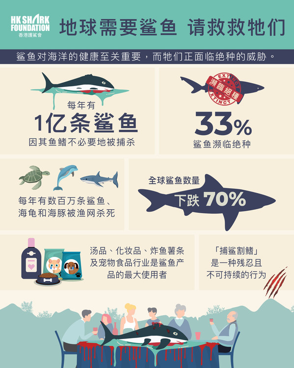 Richey 今天表示:"全球超过50% 的鱼翅透过香港为中间点进行交易,我们有责任处理这场危机。"她又指:"鲨鱼是脆弱的海洋食物链的重要组成部分。 鲨鱼产品的需求导致大量物种迅速减少,其中一些更已经濒临绝种,包括大白鲨、鲸鲨和锤头鲨。鲨鱼绝种将威胁整个海洋生态系统的平衡,海洋生态系统无疑是宝贵的食物来源和调节气候的关键要素。 海洋吸收二氧化碳并产生氧气,这对地球上的生命至关重要。"