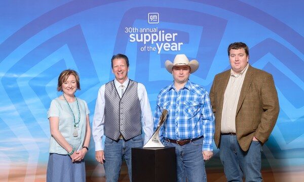 Mando America的一位高管正在通用汽车“2021年度最佳供应商”颁奖典礼上拍摄纪念照。照片从左起分别是Alison Ellis(Mando America刹车销售主管)、Tom McMillen(通用汽车全球底盘采购执行董事)、Jeff Pontius(Mando America刹车研发总监)和Jamie Lowe(Mando America客户服务总监)。