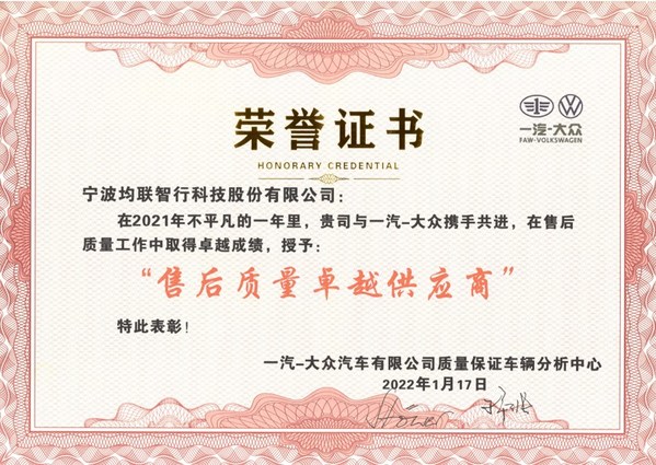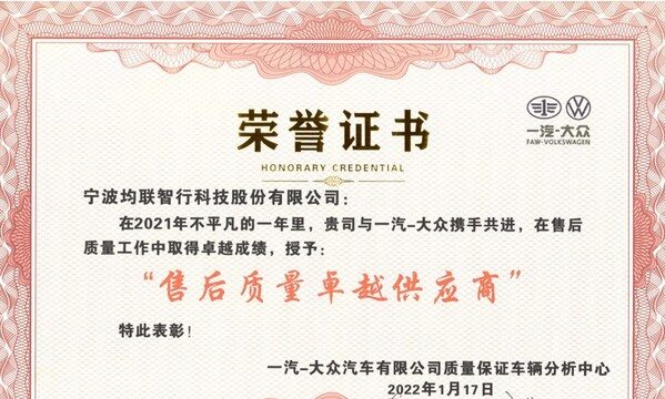 浙江宁波2022年3月29日 /新闻稿网 - Xinwengao.com/ — 近日,均联智行荣获2021年度一汽-大众“售后质量卓越供应商”奖项。作为“娱乐系统电器件”领域唯一获奖的供应商,均联智行以优异的服务水平与产品品质,获得客户的高度认可。