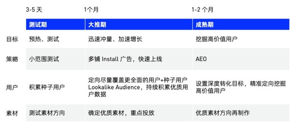 测试期一般3-5天左右。主要是小范围测试,积累种子用户,这个阶段主要会看基础的数据指标,如留存、转化成本、LTV等。同时,测试期需测试素材方向和调试产品。如果数据表现符合目标,就会进入大推期,这个阶段需要迅速冲量,加速增长。策略是多铺install广告,也就是将优化目标设置为应用安装。根据过往经验,Nativex一般建议开发者可基于种子用户的特征找相似用户,扩大覆盖面。同时,素材方向也要找准优质素材来重点投放。