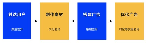 回到买量实操过程,唐子丹从触达用户、制作素材、搭建广告、优化广告四个环节对比海内外买量的差异。