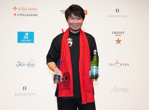 Chef-owner Zaiyu Hasegawa celebrates Den’s No.1 win at the Asia’s 50 Best Restaurants 2022 awards ceremony, sponsored by S.Pellegrino & Acqua Panna
