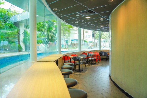 这间风光独特的麦当劳餐厅位于三亚亚龙湾度假区核心区域,拥有得天独厚的地理位置优势,坐拥泳池、举目望海,独具自然视角。在建造过程中,餐厅采用低碳环保的新型建材,加强对固体废弃物的回收,真正实现了绿色循环,环保共生。此外,餐厅还通过应用高标准的新风管理设备,把控室内空气品质,力图保证餐厅员工和顾客体验的舒适、健康与安全。