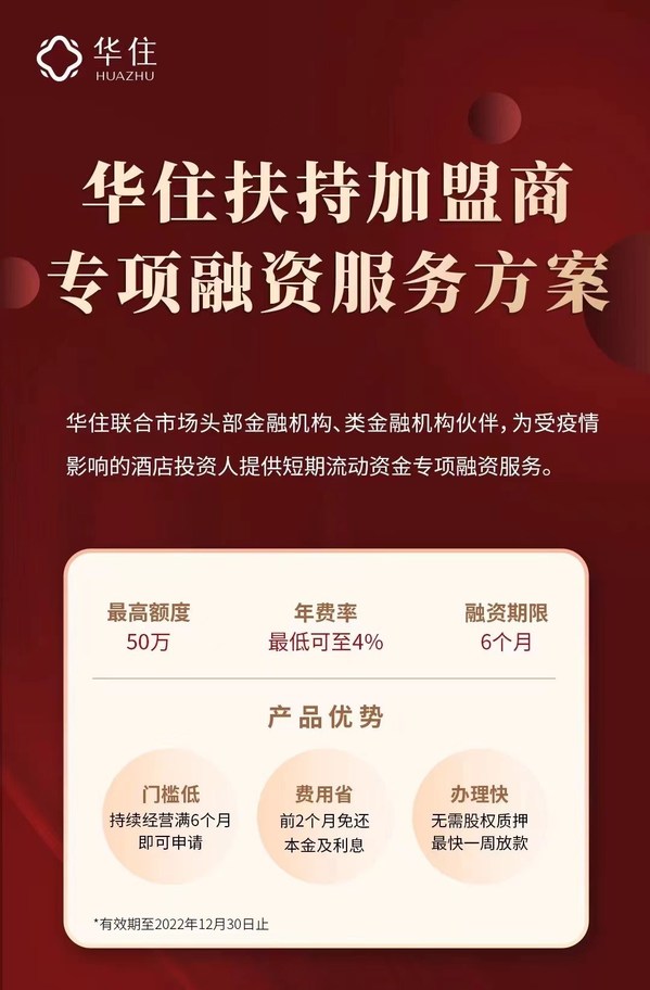 上海2022年4月11日 /新闻稿网 - Xinwengao.com/ — 今年以来,受奥密克戎病毒影响,酒店业加盟商再次遭受重创。为了帮助加盟商们纾困解难,华住出台了"专项融资扶持计划"。 "帮扶融资"产品主要针对受疫情影响的门店,为加盟商补充短期流动资金。只要当前在营业状态,开业满6个月以上即可申请。额度最高50万,最长可使用6个月,年费率最低可至4%,且前2个月无需归还融资款,真正帮助到加盟商缓解资金压力。 不仅如此,华住还为帮扶融资搭建了绿色通道,加盟商提交完整资料后最快一周内放款,自推出一周以来已收到超过200家门店的申请和咨询,放款工作也在有序进行中。 各类融资产品灵活机动最大范围惠及加盟商 除"帮扶融资"产品外,为最大范围惠及加盟商,华住将各类融资产品门槛均大幅度降低,不同融资产品可针对性的覆盖在营老店运营、翻新升级、新店营建以及翻牌等多方面需求,同时与工商银行、招商银行、平安租赁、京东金融、同程金服等金融机构及类金融机构达成战略合作,为加盟商提供坚强的资金后盾。 多个项目融资落地加盟商减负轻装前行 在华住融资政策支持下,多个加盟商顺利获得融资。对加盟商来说,这些融资政策无异于雪中送炭。西安的刘总是华住的老加盟商,在西安运营多家华住旗下品牌酒店。在疫情下,刘总也出现了短期流动资金缺口,为保证酒店正常经营,帮助加盟商渡过短期难关,华住融资团队在最短时间内为刘总发放了100万元帮扶融资。放款后,刘总对华住大加赞扬,"你们的团队很专业,一直为加盟商设身处地考虑,所以我只做华住品牌,未来也希望能够得到华住更多的帮助。" 疫情之下,很多加盟商步履维艰。为了确保能够及时为他们纾困解难,华住设置了清晰的流程以缩短加盟商申请路径,还搭建了专门团队帮助加盟商选择最合适的资金方案和产品,主动服务提高效率。江苏连云港某汉庭加盟商朱总说,"虽然暂时不需要资金,但是看到这个政策之后,感到华住给予了业主充分的踏实感。" 正如华住集团CEO金辉在《致广大华住酒店合伙人(加盟商)的一封信》中说的那样,"疫情的肆虐把原本美好的春天变成了寒冷的冬天,但是我们有信心在艰难困苦中前行!"华住与加盟商共克时艰,通过一系列力度大、针对性强、方便快捷的融资政策扶持,让加盟商可以在疫情阴霾下挺得住、过难关、有奔头!
